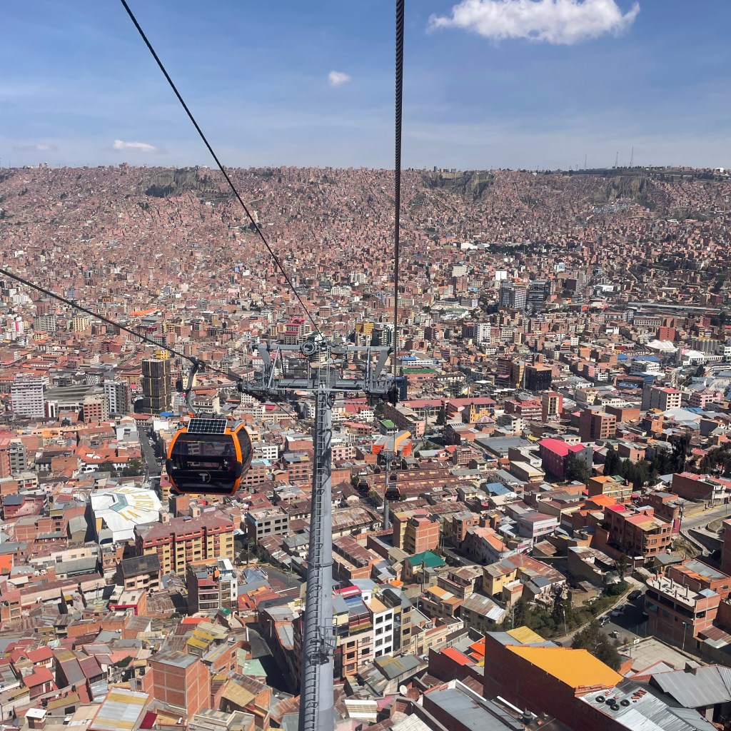 The line runs from La Paz to El Alto. Those are two completely different cities! The cost is 3 Bolivianos one way (0.40 Euro/0.43 USD as of writing). And while there is a crowd, there’s space, which isn’t necessarily the case when riding buses or walking the streets of La Paz.